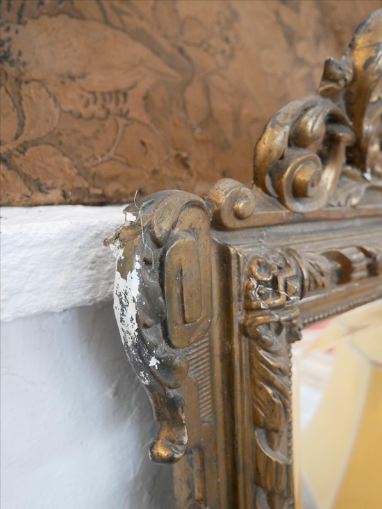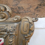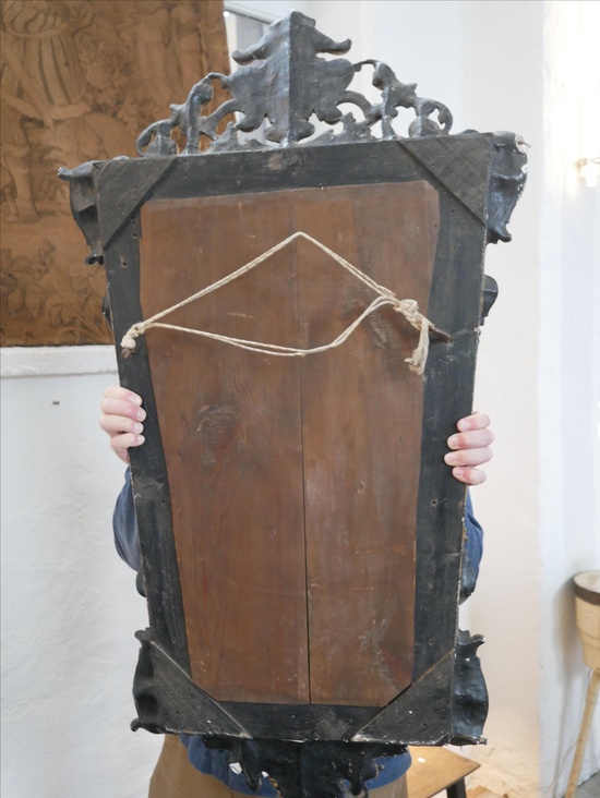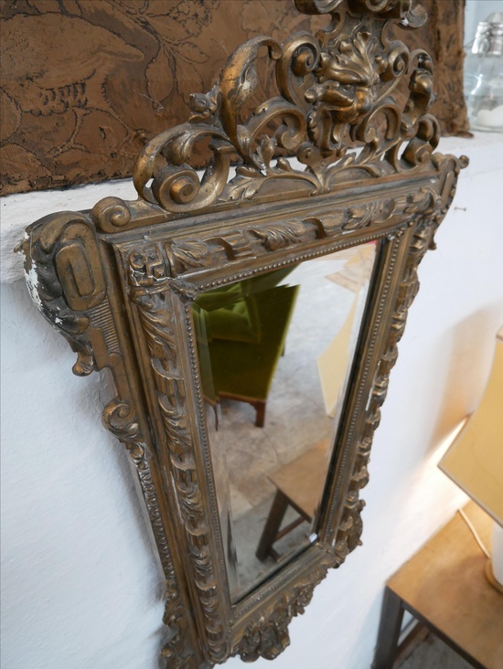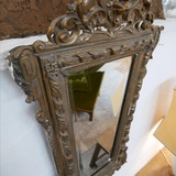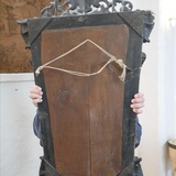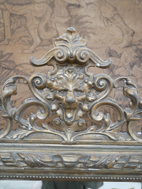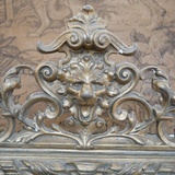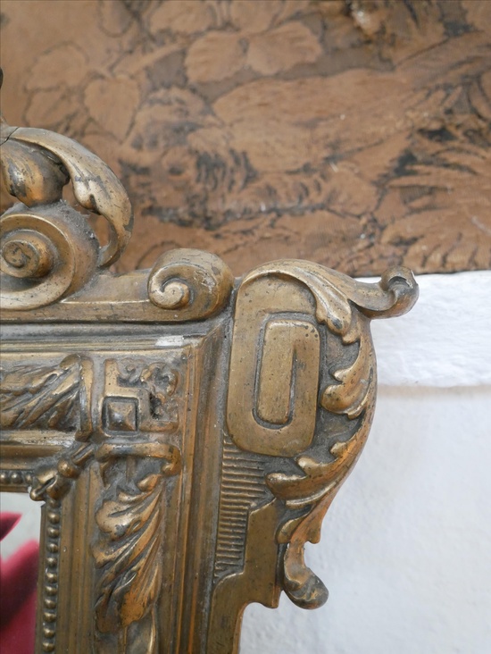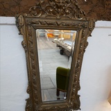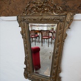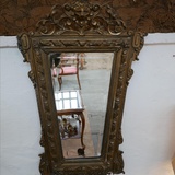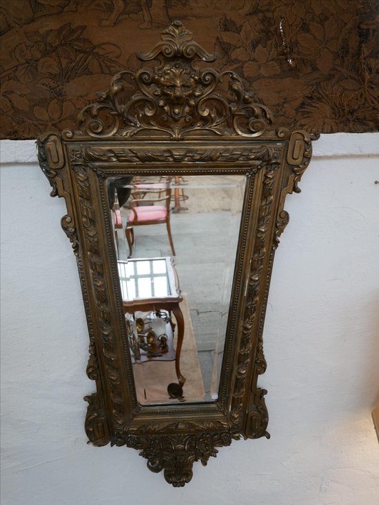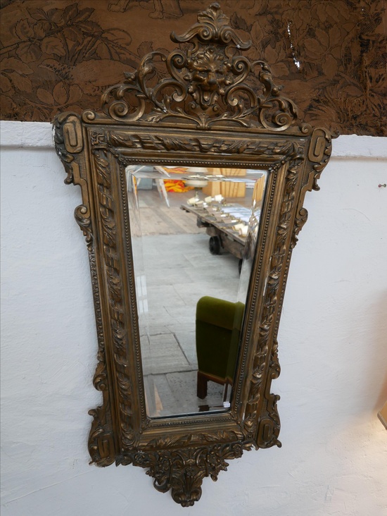 Prächtig verzierter Wandspiegel aus dem Havelland, gefertigt um 1900. Besonders auffällig ist der ausdrucksstarke Löwenkopf im oberen Bereich des Rahmens, der von floralen und rankenden Ornamenten eingerahmt wird. Der schwere Rahmen ist aus dunklem, patiniertem Gussmaterial gefertigt und verleiht dem Spiegel seinen herrschaftlichen Charakter, ein seltenes Sammlerstück aus der Zeit um die Jahrhundertwende.