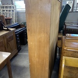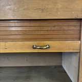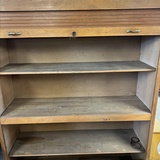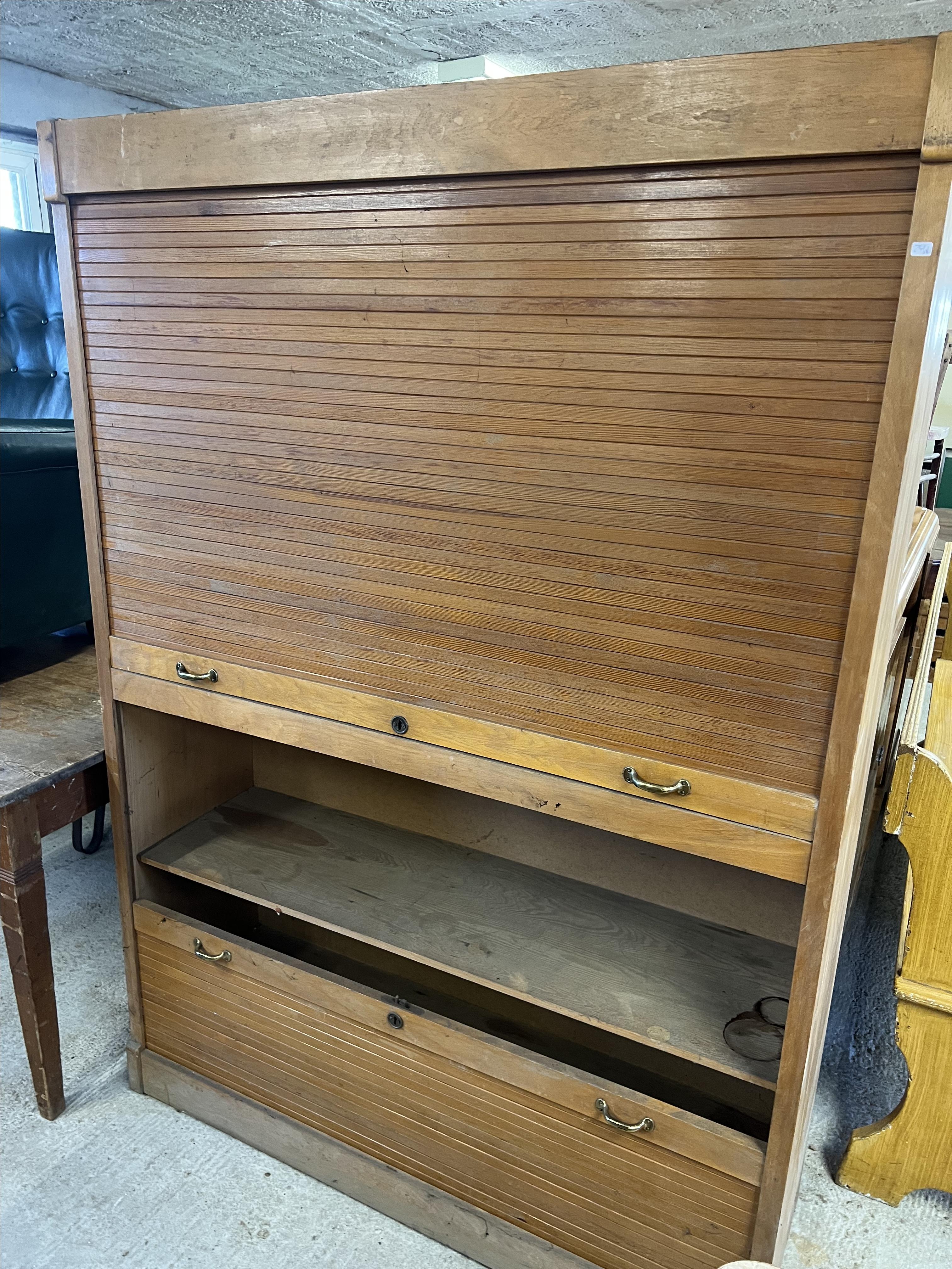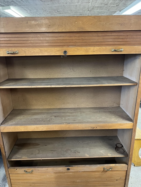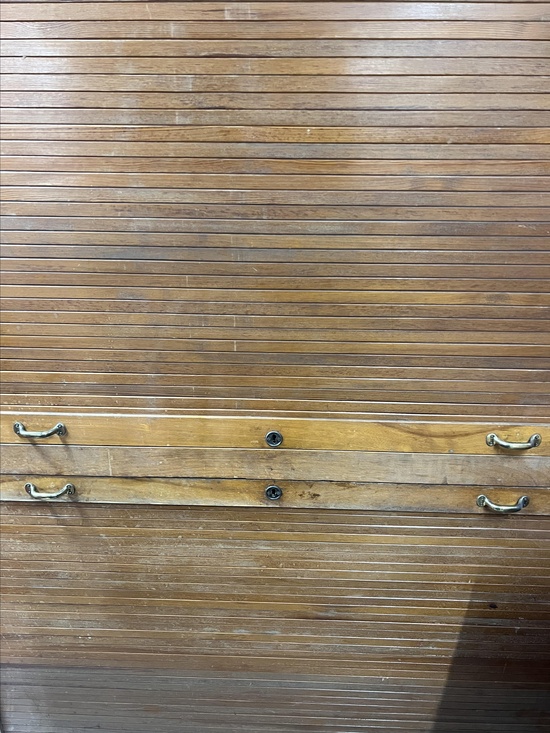 Dieser klassische Jalousieschrank aus Holz verfügt über zwei separate Rolltüren, die sich jeweils nach oben und unten öffnen lassen. Die feinen Holzlamellen gleiten elegant in den Korpus und geben zwei großzügige Fächer frei – ideal zur Aufbewahrung von Akten, Unterlagen oder Büchern.