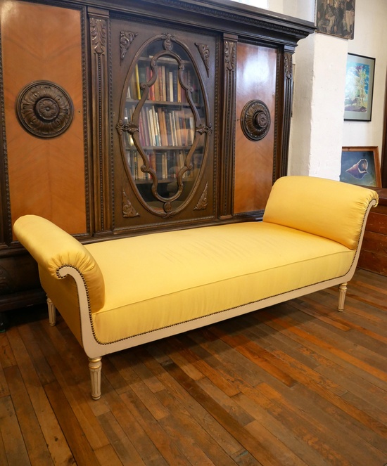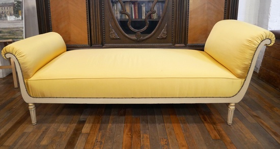 Chaiselongue im historisierenden Stil mit erhöhtem Kopfende.
