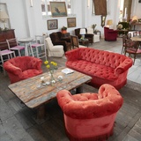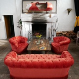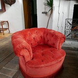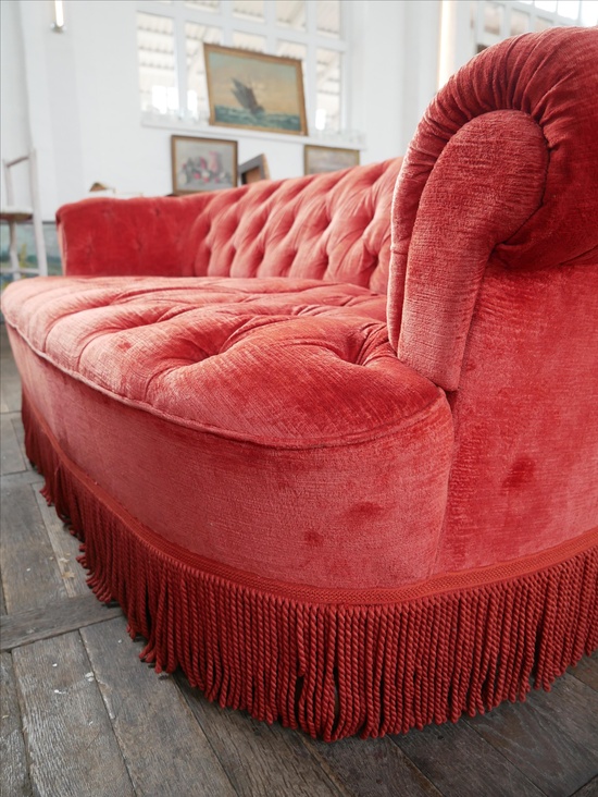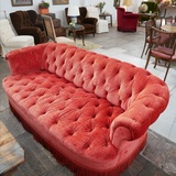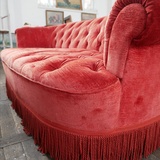 Ein stilvolles Ensemble mit Geschichte: Diese klassische Sitzgruppe aus den 1930er-Jahren besticht durch ihr leuchtend rotes Samtpolster und ihre geschwungene Formensprache im Stil der Zeit. Das Set besteht aus einem Dreisitzer-Sofa und zwei passenden Sesseln mit aufwendig gearbeiteter Rückenheftung und Fransenabschluss.