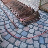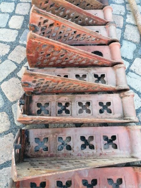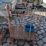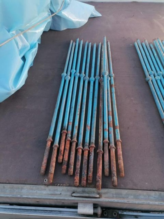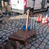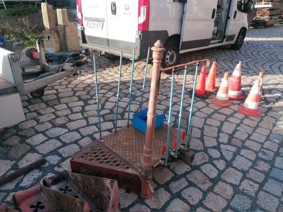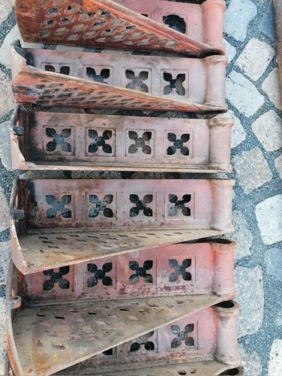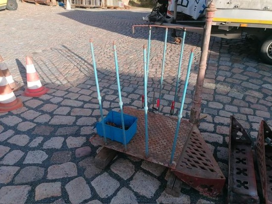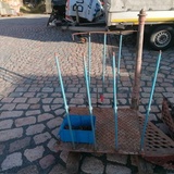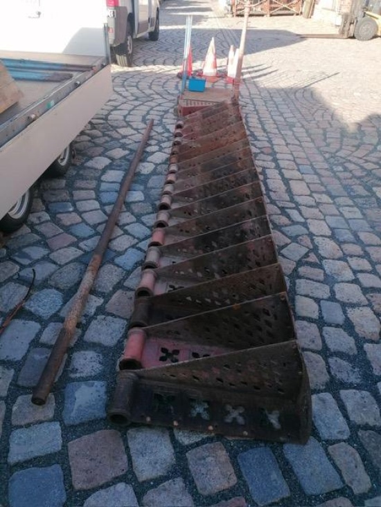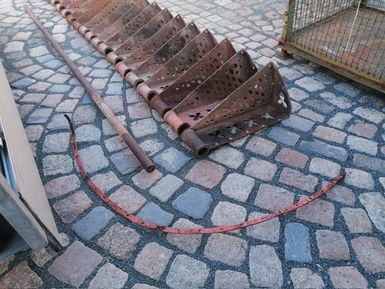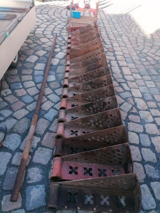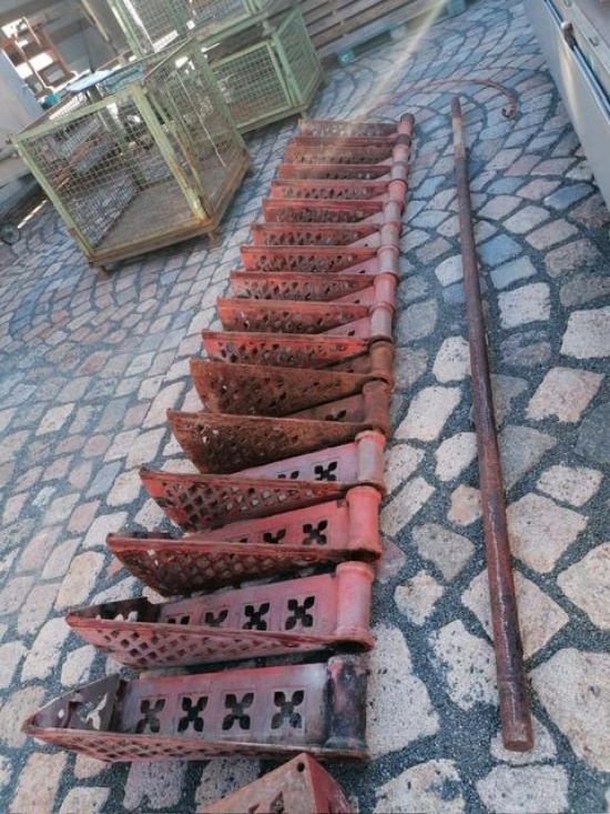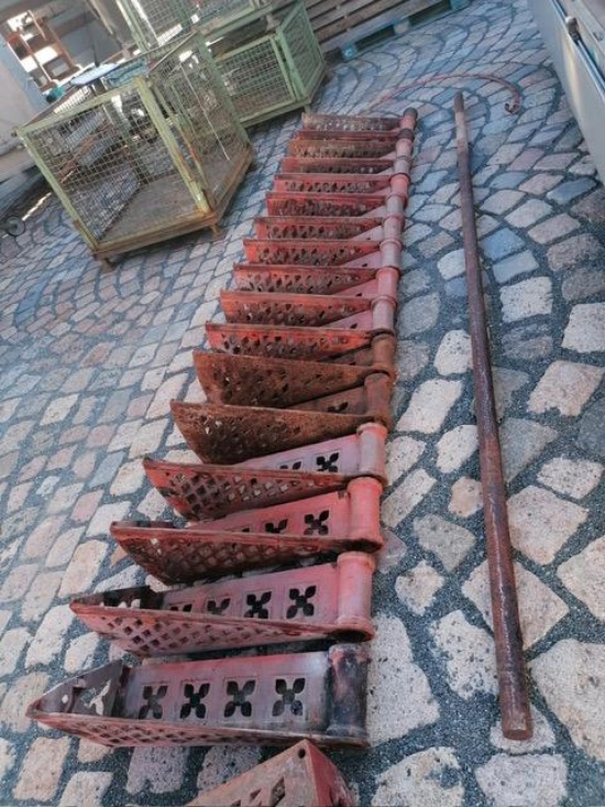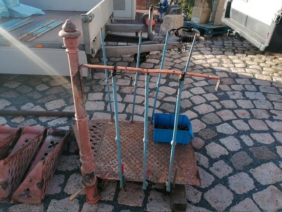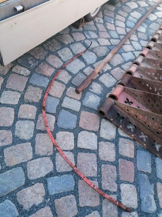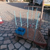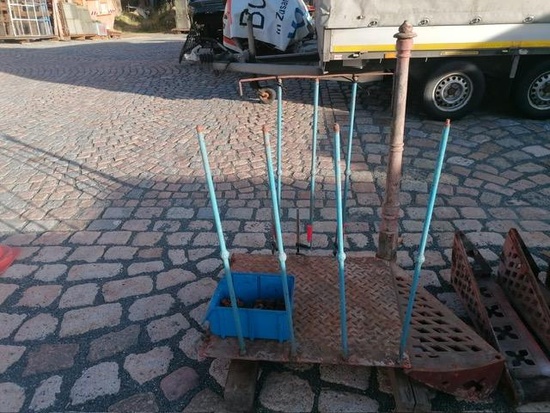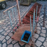 Handlauf Flacheisen auf einer Seite fehlend Standrohr Ca. 3.58m Lang Säulenabschluß Ca. 1.02m hoch 1mal Handlauf Flacheisen für Treppe vorhanden 1mal fehlend 25mal Stacheten für Handlauf vorhanden 1mal Kiste mit Schrauben / Muttern / etc. dabei