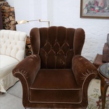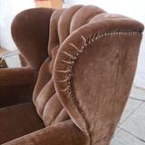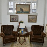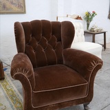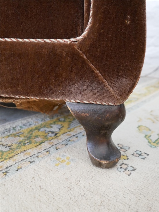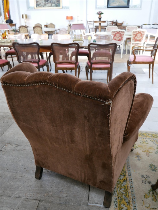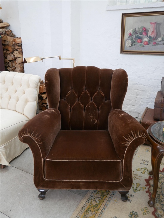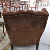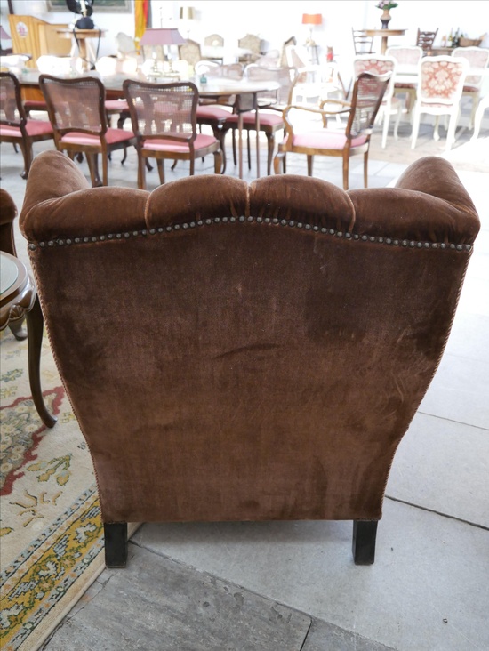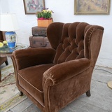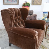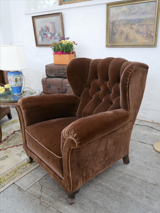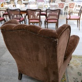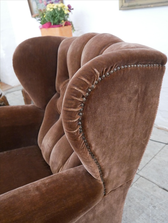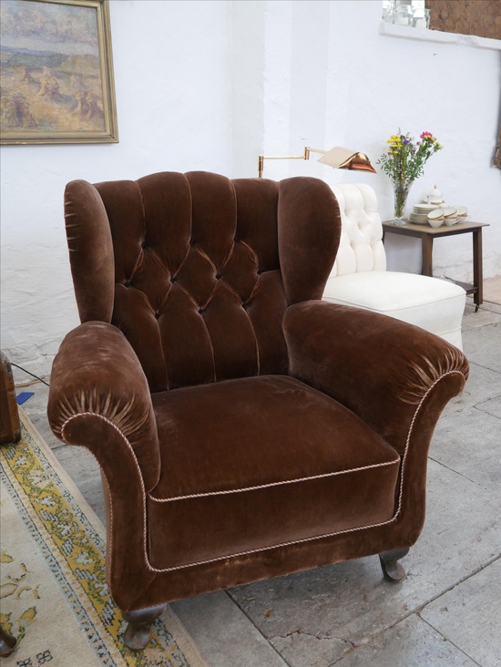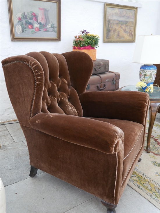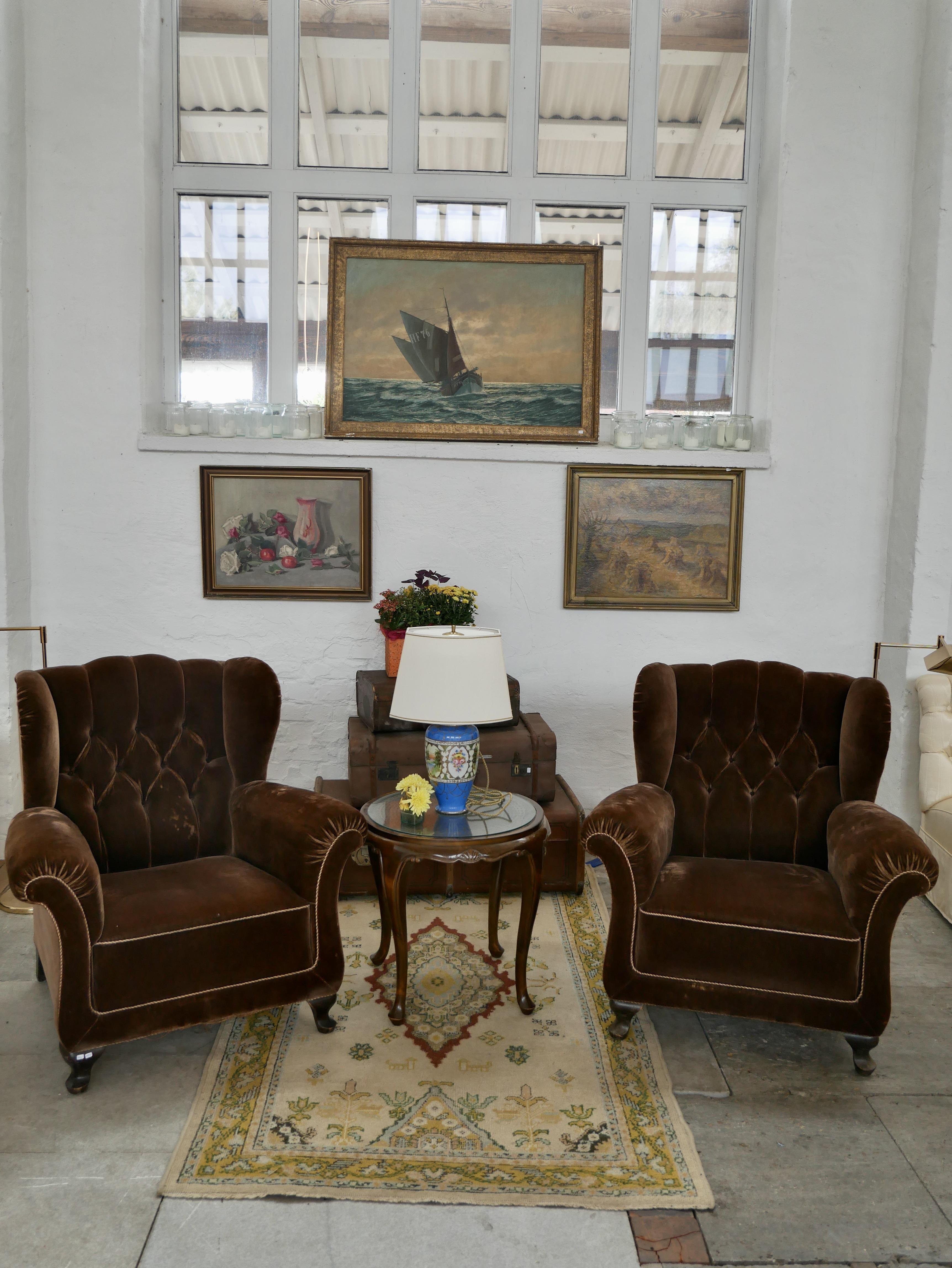 Zwei klassische Sessel aus den 1930er Jahren mit samtigem Stoffbezug in tiefem Braun. Die elegante Rückenlehne mit Knopfheftung und die geschwungenen Armlehnen verleihen den Sesseln zeitlosen Charme.
