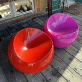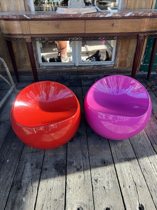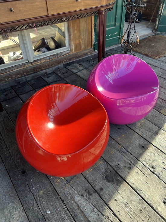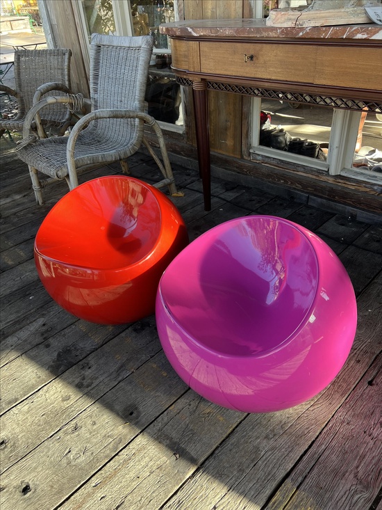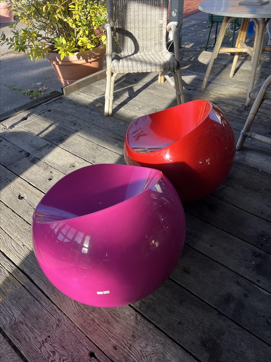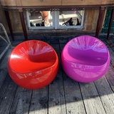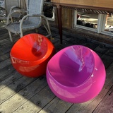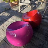 Zwei kugelförmige Kunststoffsessel in Pink und Rot