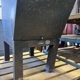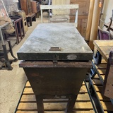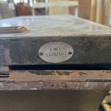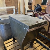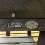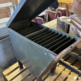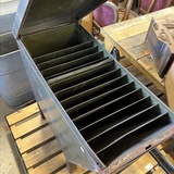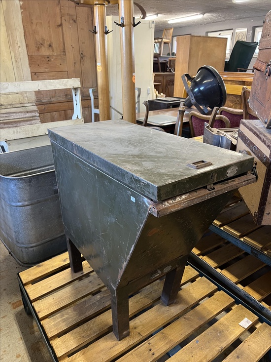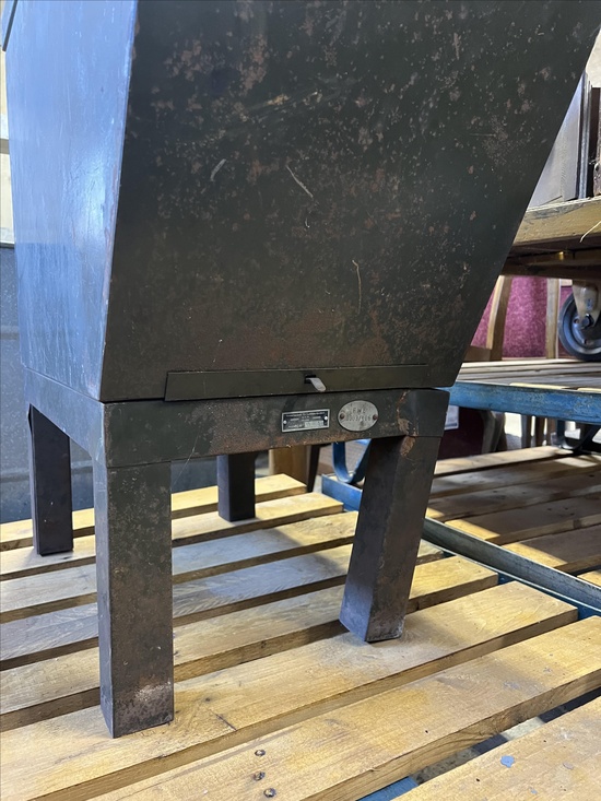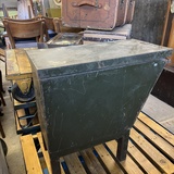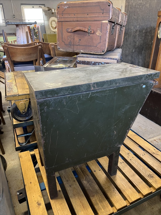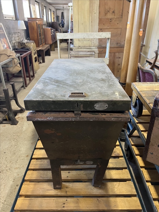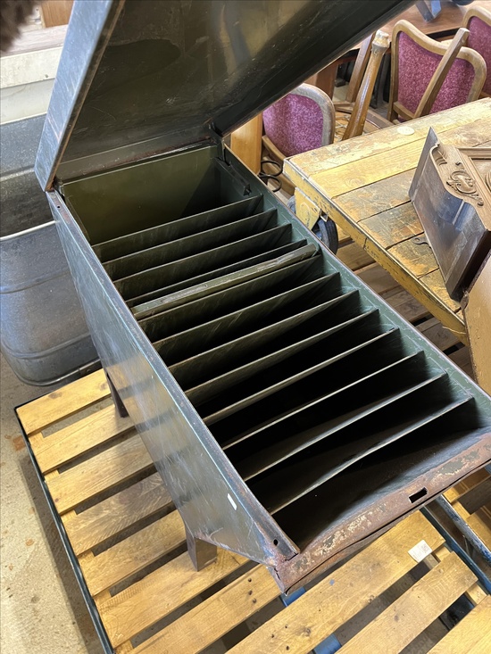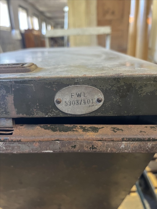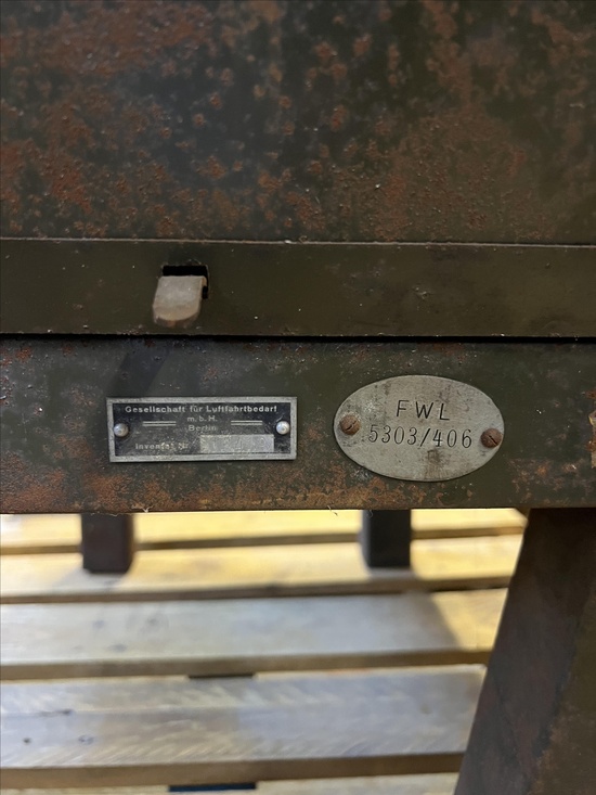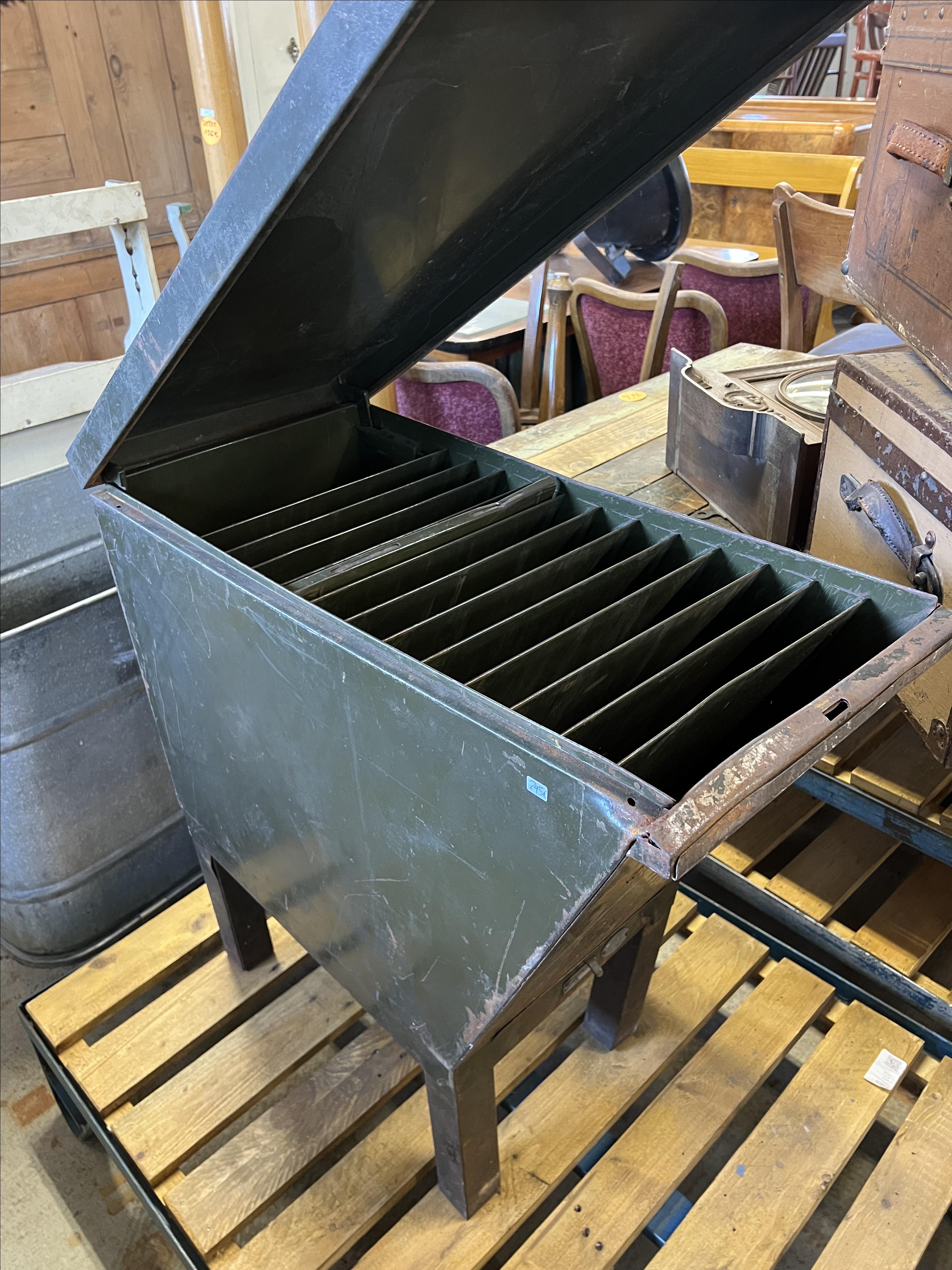 A rare industrial file cabinet made of solid metal, featuring a hinged lid and internal dividers for organized document or blueprint storage. This original piece comes from the Berlin Society for Aviation Supplies and impresses with its authentic industrial character.